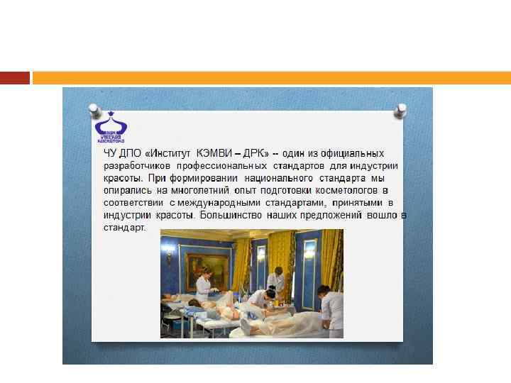 МЕЖДУНАРОДНЫЕ СТАНДАРТЫ Признаются по всему миру ITEC (СIDESCO) (квалификационные и образовательные стандарт) HABBIA (отраслевые стандарты) WORLDSKILLS (сквозные стандарты, уровень олимпиады) • ДОМ РУССКОЙ КОСМЕТИКИ – ЕДИНСТВЕННОЕ УЧЕБНОЕ ЗАВЕДЕНИЕ, АККРЕДИТОВАННОЕ В ITEC ПО ЭСТЕТИЧЕСКОЙ КОСМЕТОЛОГИИ • ПРЕПОДАВАТЕЛИ ДОМА РУССКОЙ КОСМЕТИКИ ИМЕЮТ МЕЖДУНАРОДНУЮ КВАЛИФИКАЦИЮ И ЯВЛЯЮТСЯ ЭКСПЕРТАМИ МЕЖДУНАРОДНОГО УРОВНЯ