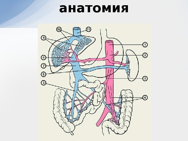 Пресинусоидальный блок может развиваться в результате сдавления вен (шистосомоз, бо-лезнь Вильсона, обтурационная желтуха) и при дополнительном притоке артериальной крови в воротную вену (артериовенозные свищи, пресинусоидальные сообщения меж-ду артериолами и венулами у больных цирро-зом печени). Парасинусоидальный блок обусловлен разбу-ханием гепатоцитов при остром гепатите, жи-ровой дистрофии печени, обтурационной желтухе и при циррозе печени. Постсинусоидальный блок возникает при на-рушении проходимости печеночных вен. По-следнее может быть вызвано сдавлением их опухолью, мембранной обструкцией нижней полой вены. Анатомия