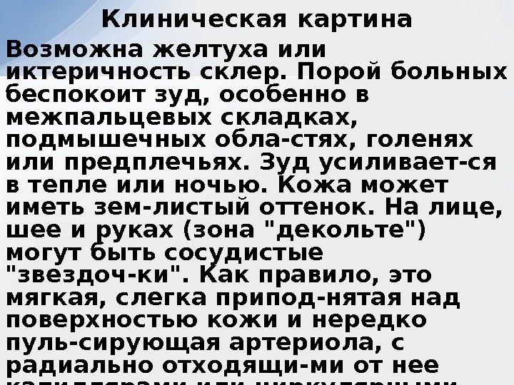Возможна желтуха или иктеричность склер. Порой больных беспокоит зуд, особенно в межпальцевых складках, подмышечных обла-стях, голенях или предплечьях. Зуд усиливает-ся в тепле или ночью. Кожа может иметь зем-листый оттенок. На лице, шее и руках (зона «декольте») могут быть сосудистые «звездоч-ки». Как правило, это мягкая, слегка припод-нятая над поверхностью кожи и нередко пуль-сирующая артериола, с радиально отходящи-ми от нее капиллярами или циркулярными зо-нами гиперемии кожи. Возможна гиперемия кончиков пальцев и ладоней — «пальмарная эритема». Иногда наблюдается ярко-красная окраска губ и языка («кардинальский язык»). Клиническая картина