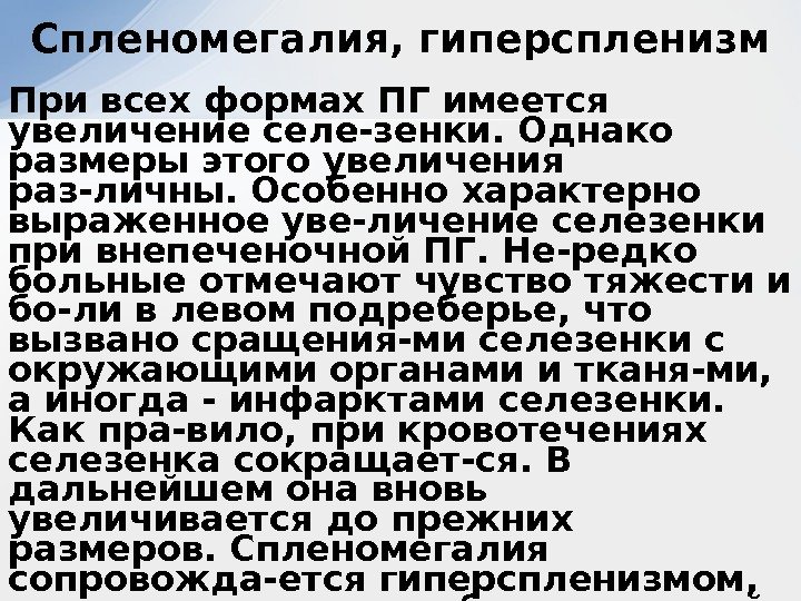 При всех формах ПГ имеется увеличение селе-зенки. Однако размеры этого увеличения раз-личны. Особенно характерно выраженное уве-личение селезенки при внепеченочной ПГ. Не-редко больные отмечают чувство тяжести и бо-ли в левом подреберье, что вызвано сращения-ми селезенки с окружающими органами и тканя-ми, а иногда — инфарктами селезенки. Как пра-вило, при кровотечениях селезенка сокращает-ся. В дальнейшем она вновь увеличивается до прежних размеров. Спленомегалия сопровожда-ется гиперспленизмом, что проявляется тромбо-цитопенией (80000 -30000), лейкопенией (3000 -1500). Отмечается постоянная умеренная ане-мия, которая даже вне кровотечения становит-ся значительной и с трудом поддается лечению. Спленомегалия, гиперспленизм