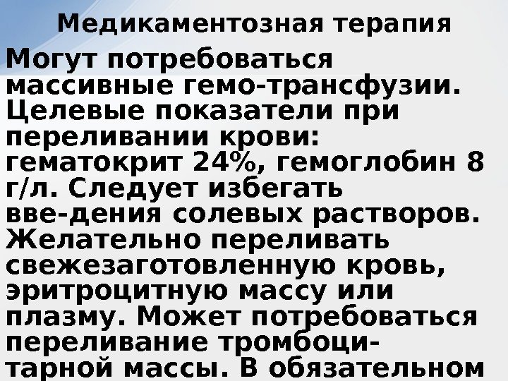 Могут потребоваться массивные гемо-трансфузии. Целевые показатели при переливании крови: гематокрит 24%, гемоглобин 8 г/л. Следует избегать вве-дения солевых растворов. Желательно переливать свежезаготовленную кровь, эритроцитную массу или плазму. Может потребоваться переливание тромбоци- тарной массы. В обязательном порядке внутримышечно вводят витамин К. На-значают ИПП (у пациентов часто раз-виваются стрессорные острые язвы). Медикаментозная терапия