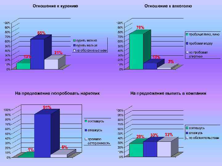 вредно Курение не вредно, если в меру вреда нет 78% 16% 3% Наркотики 79% 4% 1% Алкоголь 75% 16% 12% не знают о влиянии наркотиков на организм 6% Мы видим, что наиболее лояльное отношение у подростков к употреблению алкоголя и курению. • Необходимо значительно усилить работу по антиалкогольной и антиникотиновой пропаганде. • Сочетать работу по пропаганде здорового образа жизни с организацией досуга. Таким образом, правильно организованная профилактическая работа позволит предупредить проявления асоциального поведения среди подростков. Подростки отмечали, что взрослые проводят с ними беседы по проблемам, затронутым в анкетах. Но чаще всего эти беседы носят характер нравоучений и запретов. Подросткам хотелось бы больше говорить о том, как надо строить свои отношения с лицами противоположного пола, понять, почему люди тянутся к алкоголю, курению и наркотикам, как противостоять соблазнам и давлению сверстников, чем можно заменить асоциальный образ жизни, чтобы не остаться одному.