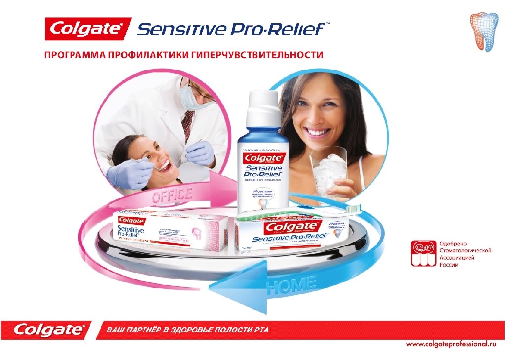 Комплекс средств Colgate® Sensitive Pro-Relief™ для домашнего использования Для поддержания и усиления десенситивного эффекта, достигнутого после применения профессиональной пасты в кабинете стоматолога, необходимо ежедневно использовать комплекс средств Colgate® Sensitive Pro-Relief™ в домашних условиях