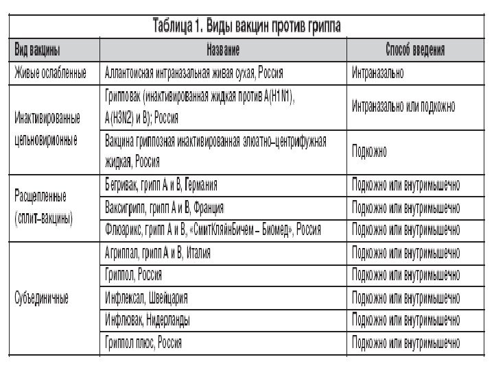 Еще один способ борьбы с гриппом – создание специфического иммунитета с помощью вакцинации. Противогриппозная вакцина – одно из самых эффективных средств борьбы с вирусом. ü Вакцина интраназальная живая аллантоисная, противогриппозная вакцина ü Вакцина гриппозная инактивированная, жидкая ü Расщепленные (сплит) вакцины (Ваксигрипп, Флюарикс) ü Субъедничные вакцины (Инфлювак, Гриппол). Благодаря высокой степени очистки их можно применять у детей с 6 -тимесячного возраста