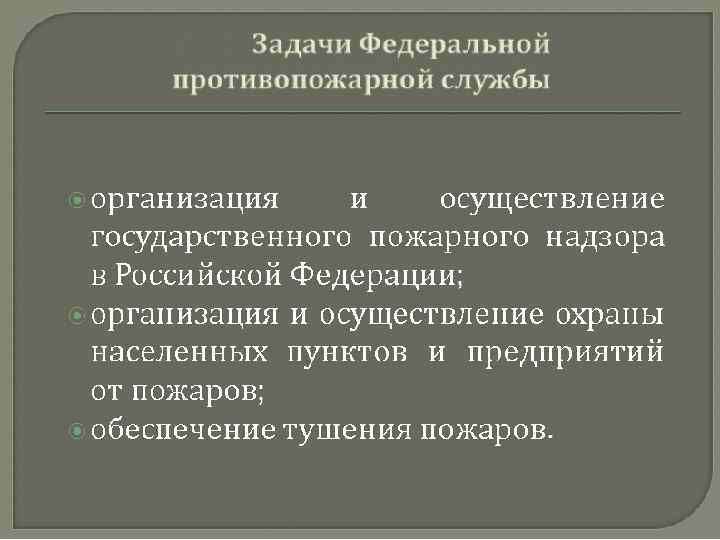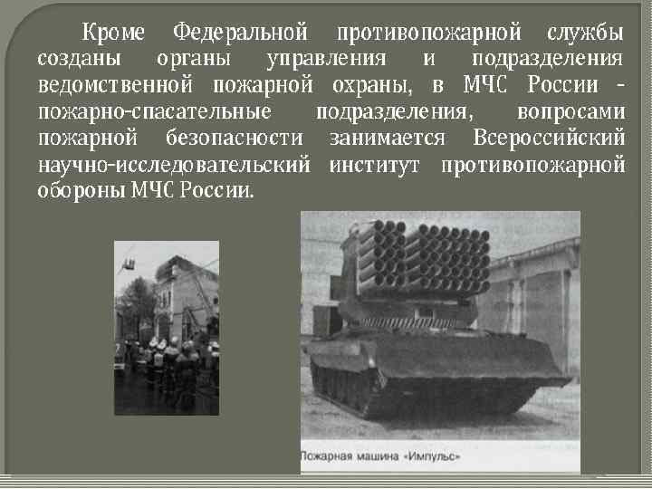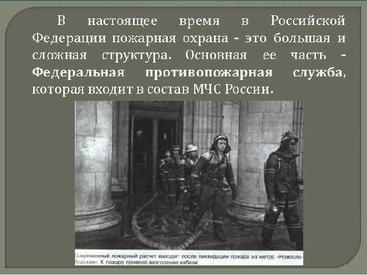 Состав пожарной охраны страны 1) Федеральная противопожарная служба, 2) Подразделения ведомственной пожарной охраны, 3) Подразделения пожарной охраны (предприятий, воинских частей, на железнодорожном транспорте, в аэропортах и морских портах), 4) Всероссийский научно-исследовательский институт противопожарной обороны МЧС России.