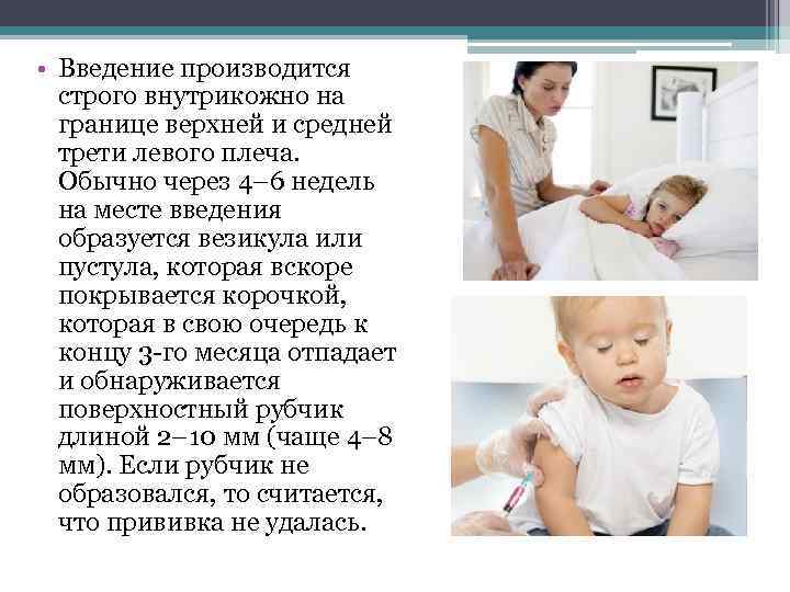 • Введение производится строго внутрикожно на границе верхней и средней трети левого плеча. Обычно через 4– 6 недель на месте введения образуется везикула или пустула, которая вскоре покрывается корочкой, которая в свою очередь к концу 3 -го месяца отпадает и обнаруживается поверхностный рубчик длиной 2– 10 мм (чаще 4– 8 мм). Если рубчик не образовался, то считается, что прививка не удалась.