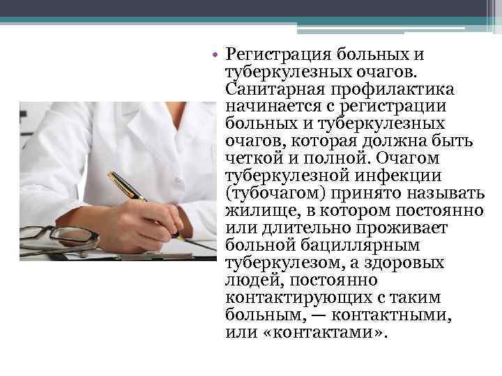 • Регистрация больных и туберкулезных очагов. Санитарная профилактика начинается с регистрации больных и туберкулезных очагов, которая должна быть четкой и полной. Очагом туберкулезной инфекции (тубочагом) принято называть жилище, в котором постоянно или длительно проживает больной бациллярным туберкулезом, а здоровых людей, постоянно контактирующих с таким больным, — контактными, или «контактами» .