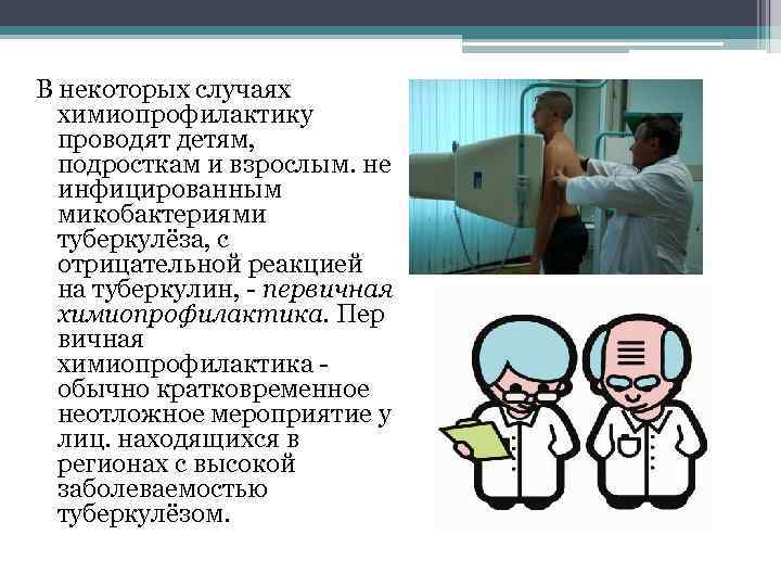 В некоторых случаях химиопрофилактику проводят детям, подросткам и взрослым. не инфицированным микобактериями туберкулёза, с отрицательной реакцией на туберкулин, - первичная химиопрофилактика. Пер вичная химиопрофилактика - обычно кратковременное неотложное мероприятие у лиц. находящихся в регионах с высокой заболеваемостью туберкулёзом.