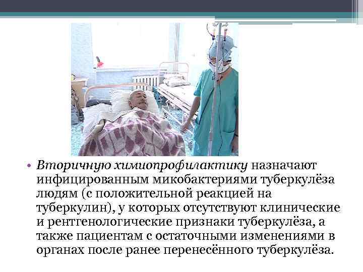 • Вторичную химиопрофилактику назначают инфицированным микобактериями туберкулёза людям (с положительной реакцией на туберкулин), у которых отсутствуют клинические и рентгенологические признаки туберкулёза, а также пациентам с остаточными изменениями в органах после ранее перенесённого туберкулёза.