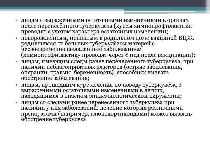 • лицам с выраженными остаточными изменениями в органах после перенесённого туберкулеза (курсы химиопрофилактики проводят с учётом характера остаточных изменений); • новорождённым, привитым в родильном доме вакциной БЦЖ. родившимся от больных туберкулёзом матерей с несвоевременно выявленным заболеванием (химиопрофилактику проводят через 8 нед после вакцинации); • лицам, имеющим следы ранее перенесённого туберкулёза, при наличии неблагоприятных факторов (острые заболевания, операции, травмы, беременность), способных вызвать обострение заболевания; • лицам, прошедшим курс лечения по поводу туберкулёза, с выраженными остаточными изменениями в лёгких, находящимся в опасном эпидемиологическом окружении; • лицам со следами ранее перенесённого туберкулёза при наличии у них заболеваний. лечение которых различными препаратами (например, глюкокортикоидами) может вызвать обострение туберкулёза