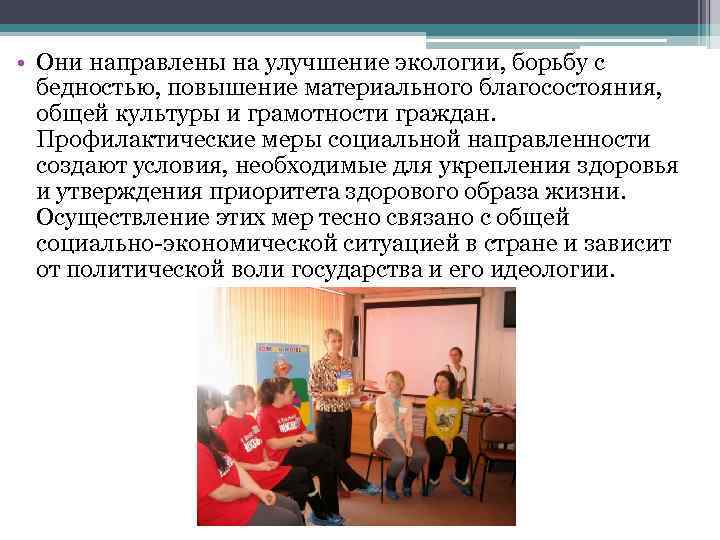 • Они направлены на улучшение экологии, борьбу с бедностью, повышение материального благосостояния, общей культуры и грамотности граждан. Профилактические меры социальной направленности создают условия, необходимые для укрепления здоровья и утверждения приоритета здорового образа жизни. Осуществление этих мер тесно связано с общей социально-экономической ситуацией в стране и зависит от политической воли государства и его идеологии.