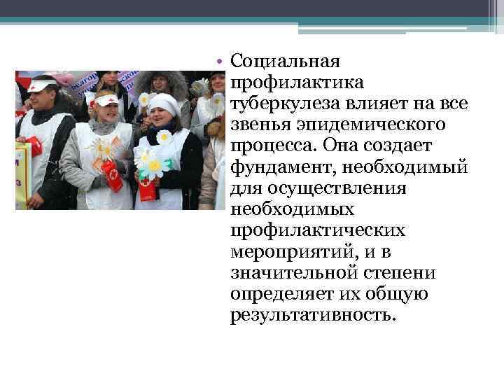 • Социальная профилактика туберкулеза влияет на все звенья эпидемического процесса. Она создает фундамент, необходимый для осуществления необходимых профилактических мероприятий, и в значительной степени определяет их общую результативность.