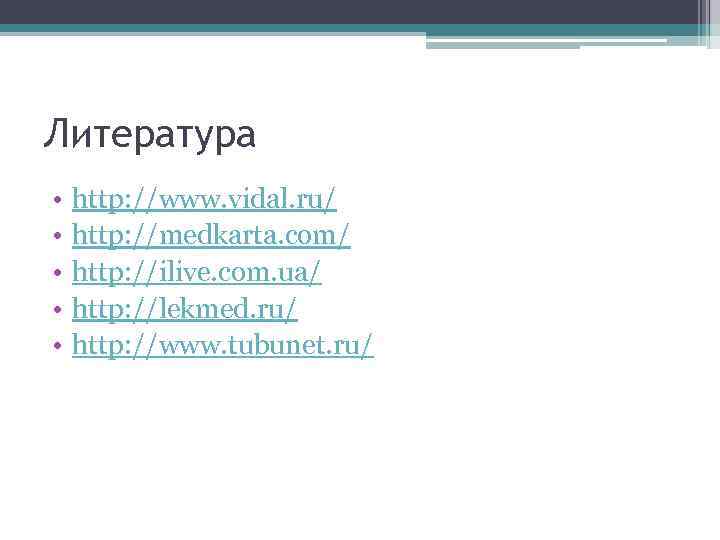 Литература • • • http: //www. vidal. ru/ http: //medkarta. com/ http: //ilive. com. ua/ http: //lekmed. ru/ http: //www. tubunet. ru/
