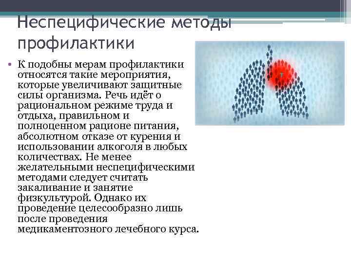 Неспецифические методы профилактики • К подобны мерам профилактики относятся такие мероприятия, которые увеличивают защитные силы организма. Речь идёт о рациональном режиме труда и отдыха, правильном и полноценном рационе питания, абсолютном отказе от курения и использовании алкоголя в любых количествах. Не менее желательными неспецифическими методами следует считать закаливание и занятие физкультурой. Однако их проведение целесообразно лишь после проведения медикаментозного лечебного курса.