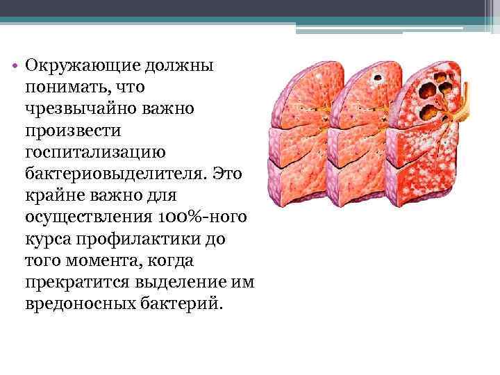 • Окружающие должны понимать, что чрезвычайно важно произвести госпитализацию бактериовыделителя. Это крайне важно для осуществления 100%-ного курса профилактики до того момента, когда прекратится выделение им вредоносных бактерий.