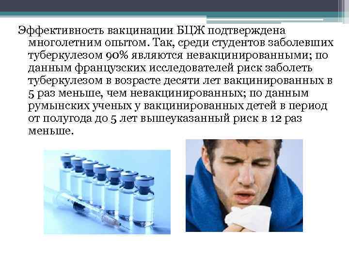 Эффективность вакцинации БЦЖ подтверждена многолетним опытом. Так, среди студентов заболевших туберкулезом 90% являются невакцинированными; по данным французских исследователей риск заболеть туберкулезом в возрасте десяти лет вакцинированных в 5 раз меньше, чем невакцинированных; по данным румынских ученых у вакцинированных детей в период от полугода до 5 лет вышеуказанный риск в 12 раз меньше.