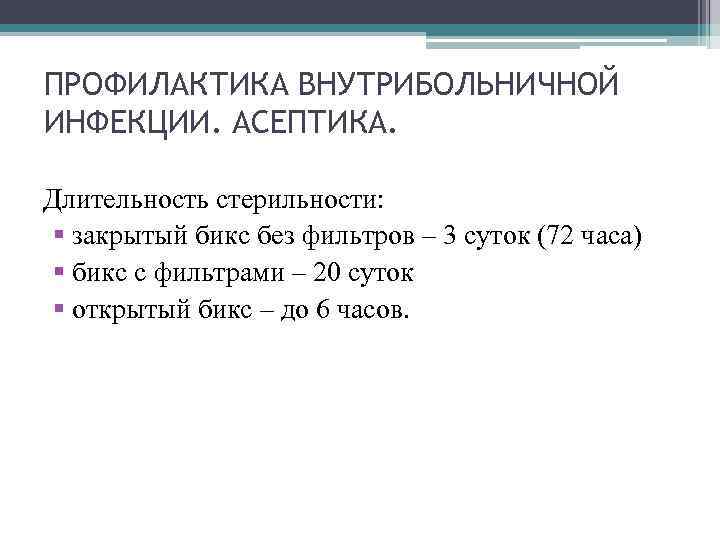 ПРОФИЛАКТИКА ВНУТРИБОЛЬНИЧНОЙ ИНФЕКЦИИ. АСЕПТИКА. Длительность стерильности: закрытый бикс без фильтров – 3 суток (72 часа) бикс с фильтрами – 20 суток открытый бикс – до 6 часов.