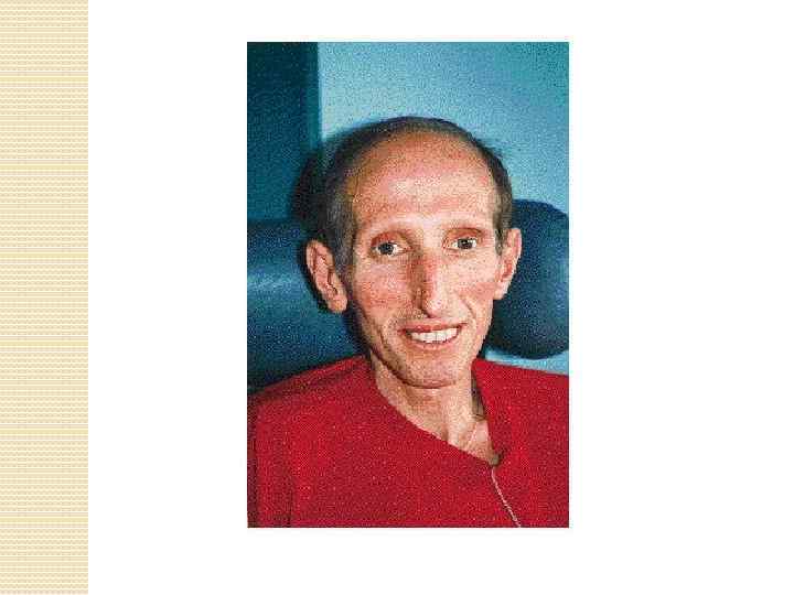 Особенности: • карликовый рост аппарата, миокарда, • малый вес (не превышающий • гипоплазия половых органов, обычно 15 -20 кг) • нарушение жирового обмена, • чрезмерно тонкая кожа • помутнение хрусталика, а • плохая подвижность суставов • атеросклероз • недоразвитый подбородок • видны все сосуды (из-за потери • маленькое лицо в сравнении с подкожного жира) размером головы, что придает • голос обычно высокий человеку как бы птичьи черты • умственное развитие • атрофия мышц соответствует возрасту • дистрофические процессы в • все больные дети зубах, волосах и ногтях; поразительно друг на друга • изменения костно-суставного похожи