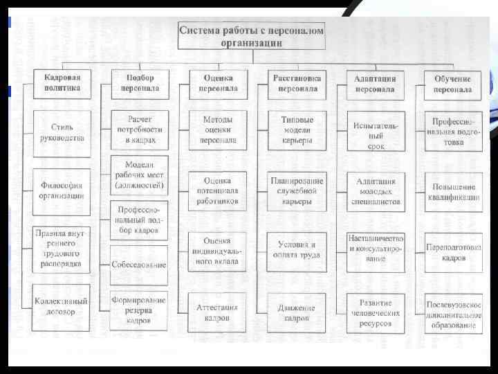 Система работы с персоналом — это совокупность принципов и методов управления кадрами рабочих и служащих в организации. Система работы с персоналом организации состоит из 6 взаимосвязанных подсистем (см. рисунок) Система работы с персоналом отражается в таких важнейших документах, как: устав организации; философия организации; правила внутреннего трудового распорядка; коллективный договор; штатное расписание предприятия; положение об оплате и премировании труда; положение о подразделениях; контракт сотрудника; должностные инструкции; модели рабочих мест; регламенты управления и др.