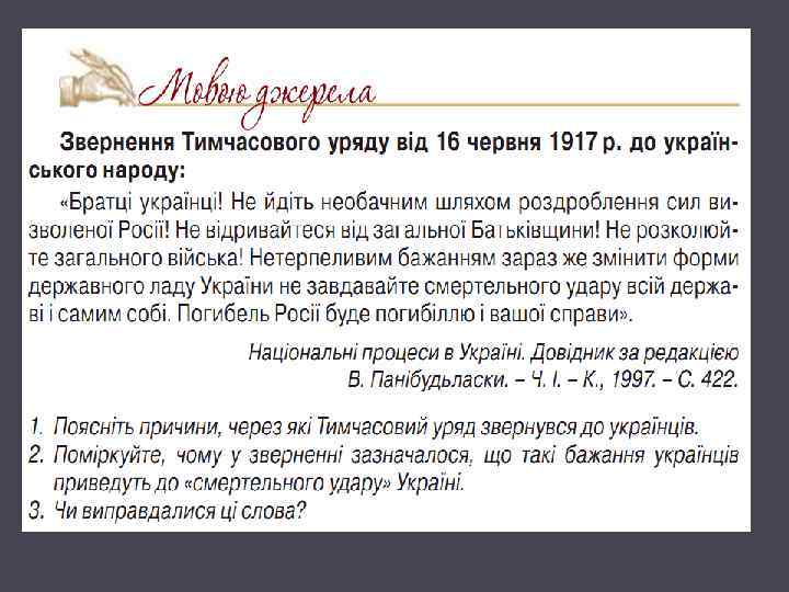 З Першого універсалу Української Центральної Ради “До українського народу на Україні й поза Україною сущого” Народе Український! Народе селян, робітників, трудящого люду! Волею своєю ти поставив нас, Українську Центральну Раду, на сторожі прав і вольностей Української землі. . Хай Україна буде вільною. Не одділяючись від всієї Росії, не розриваючись з державою Російською, хай народ український на своїй землі має право сам порядкувати своїм життям. Хай порядок і лад на Вкраїні дають вибрані вселюдським, рівним, прямим і тайним голосуванням ВСЕНАРОДНІ УКРАЇНСЬКІ ЗБОРИ (Сейм). Всі закони, що повинні дати той лад тут у нас, на Вкраїні, мають право видавати тільки наші УКРАЇНСЬКІ ЗБОРИ. Ті ж закони, що мають лад давати на всій російській державі, повинні видаватися у Всеросійськім Парламенті. . Ми гадали, що Центральне Російське Правительство протягне нам руку в сій роботі, що в згоді з ним ми, Українська Центральна Рада, зможемо дати лад нашій землі. Але Тимчасове Російське Правительство одкинуло всі наші домагання. . . І через те ми, Українська Центральна Рада, видаємо сей Універсал до всього нашого народу і оповіщаємо: однині самі будемо творити наше життя. Ухвалено: Київ, року 1917, місяця червня числа 10. Коли і ким створений документ? У зв’язку з якими подіями? Що проголошує документ? Чи можемо ми вважати це проголошенням автономії України? Поясніть, спираючись на текст. Які ще політичні кроки передбачає документ?