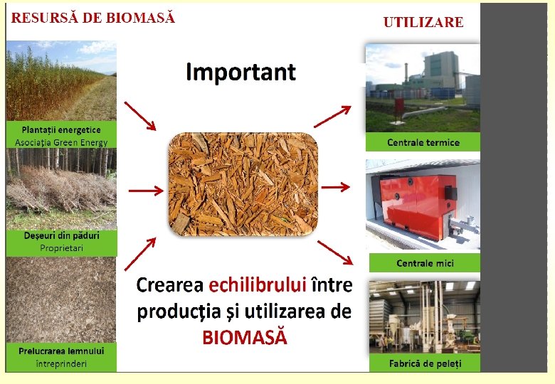 STRATEGIA CET GOVORA PENTRU REALIZAREA UNEI CENTRALE DE COGENERARE PE BIOMASA Situatia actuala: -Coardere carbune cu biomasa incepind cu anul 2008: 26000 t biomasa/2008; 15000 t biomasa/an in perioada 2009 -2013; -S-au redus emisiile anuale GHE cu pina la 60000 t CO 2 ; -S-a redus cantitatea de cenusa produsa anual cu 14000 m 3; -Energia electrica produsa nu este calificata ca energie verde si nu genereaza CV conform cu procedurile ANRE. Crearea unei piete locale de biomasa: Aria de colectare – 5 judete: Valcea, Arges, Gorj, Dolj, Sibiu Beneficii pentru mediu: Deseuri de lemn valorificate;