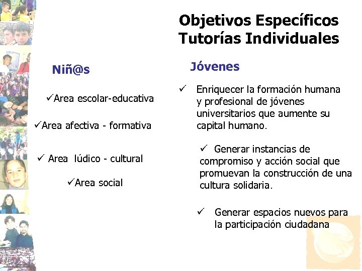 Objetivos Específicos Tutorías Individuales Niñ@s üArea escolar-educativa üArea afectiva - formativa ü Area lúdico - cultural üArea social Jóvenes ü Enriquecer la formación humana y profesional de jóvenes universitarios que aumente su capital humano. ü Generar instancias de compromiso y acción social que promuevan la construcción de una cultura solidaria. ü Generar espacios nuevos para la participación ciudadana
