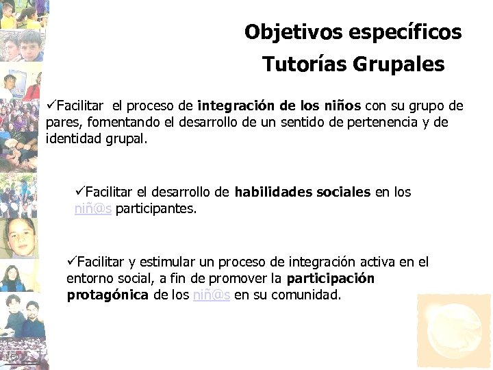 Objetivos específicos Tutorías Grupales üFacilitar el proceso de integración de los niños con su grupo de pares, fomentando el desarrollo de un sentido de pertenencia y de identidad grupal. üFacilitar el desarrollo de habilidades sociales en los niñ@s participantes. üFacilitar y estimular un proceso de integración activa en el entorno social, a fin de promover la participación protagónica de los niñ@s en su comunidad.