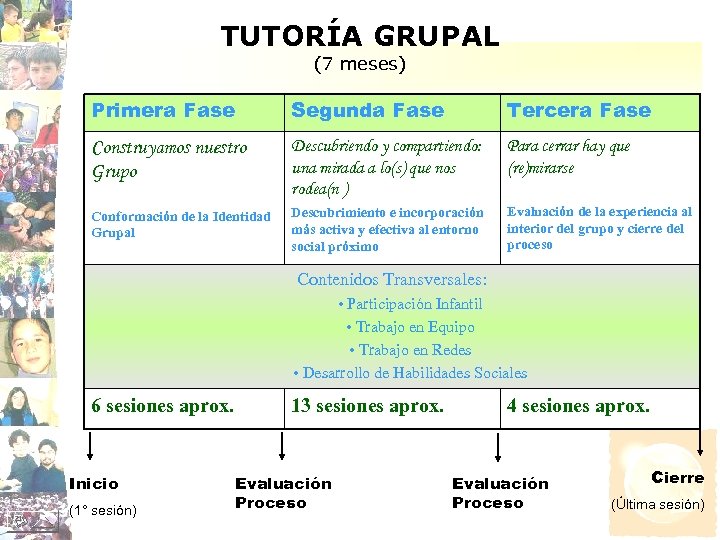 TUTORÍA GRUPAL (7 meses) Primera Fase Segunda Fase Tercera Fase Construyamos nuestro Grupo Descubriendo y compartiendo: una mirada a lo(s) que nos rodea(n ) Para cerrar hay que (re)mirarse Conformación de la Identidad Grupal Descubrimiento e incorporación más activa y efectiva al entorno social próximo Evaluación de la experiencia al interior del grupo y cierre del proceso Contenidos Transversales: • Participación Infantil • Trabajo en Equipo • Trabajo en Redes • Desarrollo de Habilidades Sociales 6 sesiones aprox. Inicio (1° sesión) 13 sesiones aprox. Evaluación Proceso 4 sesiones aprox. Evaluación Proceso Cierre (Última sesión)