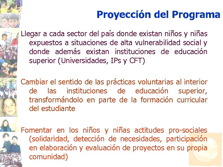 Proyección del Programa Llegar a cada sector del país donde existan niños y niñas expuestos a situaciones de alta vulnerabilidad social y donde además existan instituciones de educación superior (Universidades, IPs y CFT) Cambiar el sentido de las prácticas voluntarias al interior de las instituciones de educación superior, transformándolo en parte de la formación curricular del estudiante Fomentar en los niños y niñas actitudes pro-sociales (solidaridad, detección de necesidades, participación en elaboración y evaluación de proyectos en su propia comunidad)