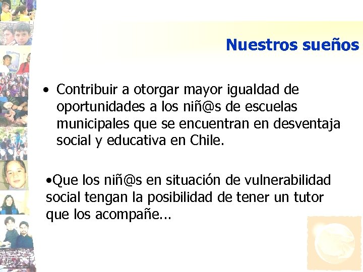 Nuestros sueños • Contribuir a otorgar mayor igualdad de oportunidades a los niñ@s de escuelas municipales que se encuentran en desventaja social y educativa en Chile. • Que los niñ@s en situación de vulnerabilidad social tengan la posibilidad de tener un tutor que los acompañe. . .