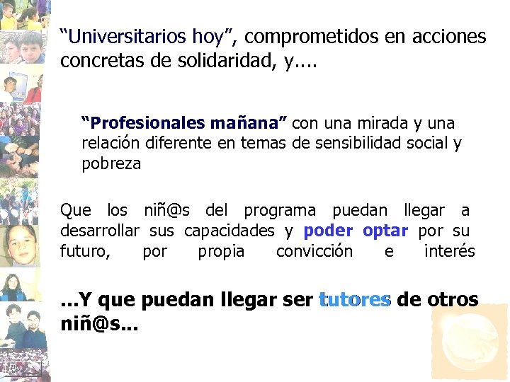 “Universitarios hoy”, comprometidos en acciones concretas de solidaridad, y. . “Profesionales mañana” con una mirada y una relación diferente en temas de sensibilidad social y pobreza Que los niñ@s del programa puedan llegar a desarrollar sus capacidades y poder optar por su futuro, por propia convicción e interés . . . Y que puedan llegar ser tutores de otros niñ@s. . .