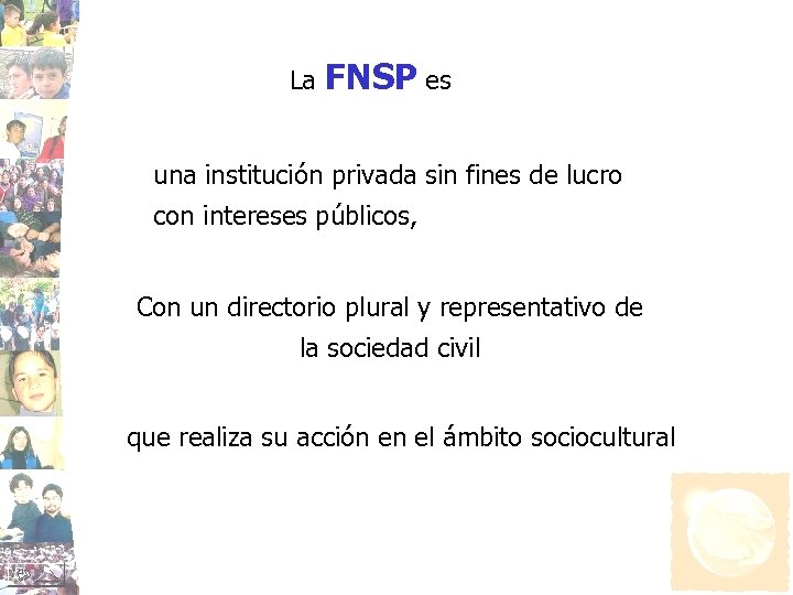 La FNSP es una institución privada sin fines de lucro con intereses públicos, Con un directorio plural y representativo de la sociedad civil que realiza su acción en el ámbito sociocultural