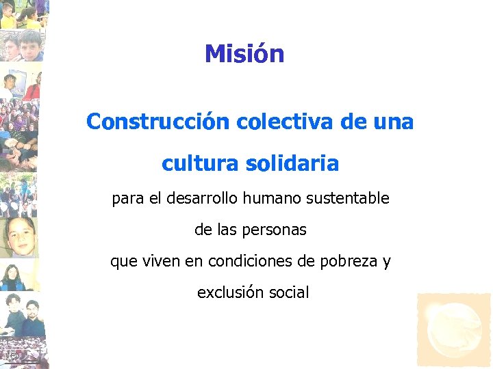 Misión Construcción colectiva de una cultura solidaria para el desarrollo humano sustentable de las personas que viven en condiciones de pobreza y exclusión social