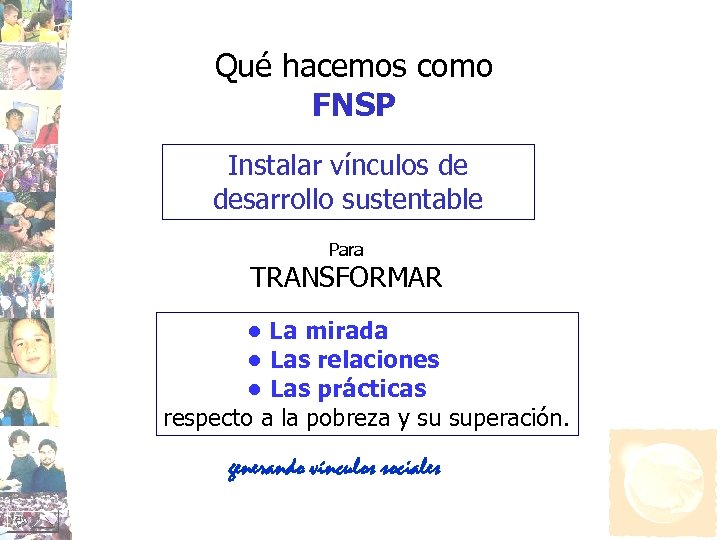 Qué hacemos como FNSP Instalar vínculos de desarrollo sustentable Para TRANSFORMAR • La mirada • Las relaciones • Las prácticas respecto a la pobreza y su superación. generando vínculos sociales