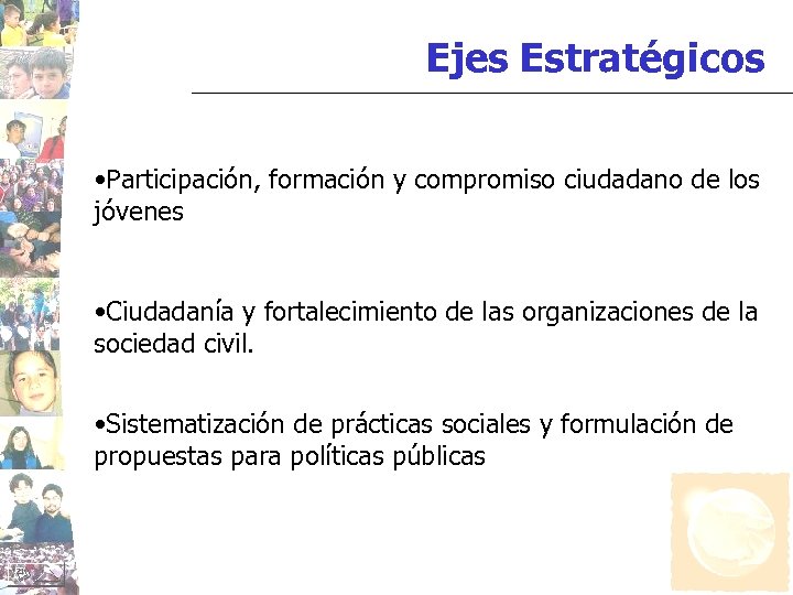 Ejes Estratégicos • Participación, formación y compromiso ciudadano de los jóvenes • Ciudadanía y fortalecimiento de las organizaciones de la sociedad civil. • Sistematización de prácticas sociales y formulación de propuestas para políticas públicas