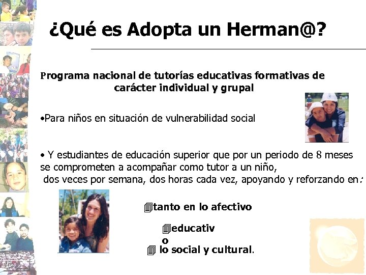 ¿Qué es Adopta un Herman@? Programa nacional de tutorías educativas formativas de carácter individual y grupal • Para niños en situación de vulnerabilidad social • Y estudiantes de educación superior que por un periodo de 8 meses se comprometen a acompañar como tutor a un niño, dos veces por semana, dos horas cada vez, apoyando y reforzando en : 4 tanto en lo afectivo 4 educativ o 4 lo social y cultural.