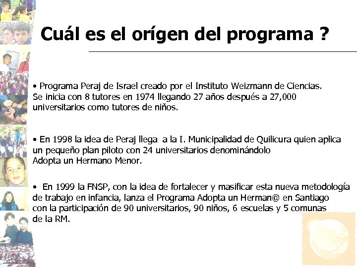 Cuál es el orígen del programa ? • Programa Peraj de Israel creado por el Instituto Weizmann de Ciencias. Se inicia con 8 tutores en 1974 llegando 27 años después a 27, 000 universitarios como tutores de niños. • En 1998 la idea de Peraj llega a la I. Municipalidad de Quilicura quien aplica un pequeño plan piloto con 24 universitarios denominándolo Adopta un Hermano Menor. • En 1999 la FNSP, con la idea de fortalecer y masificar esta nueva metodología de trabajo en infancia, lanza el Programa Adopta un Herman@ en Santiago con la participación de 90 universitarios, 90 niños, 6 escuelas y 5 comunas de la RM.