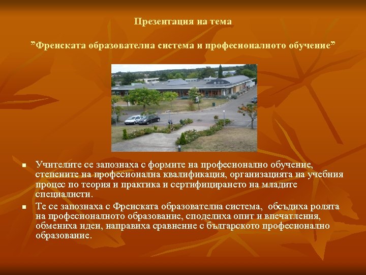 Презентация на тема ”Френската образователна система и професионалното обучение” n n Учителите се запознаха с формите на професионално обучение, степените на професионална квалификация, организацията на учебния процес по теория и практика и сертифицирането на младите специалисти. Те се запознаха с Френската образователна система, обсъдиха ролята на професионалното образование, споделиха опит и впечатления, обмениха идеи, направиха сравнение с българското професионално образование.