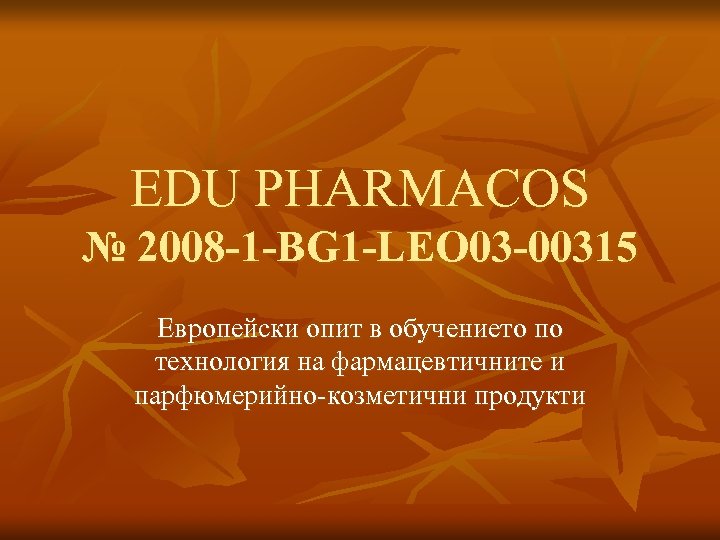 EDU PHARMACOS № 2008 -1 -BG 1 -LEO 03 -00315 Европейски опит в обучението по технология на фармацевтичните и парфюмерийно-козметични продукти
