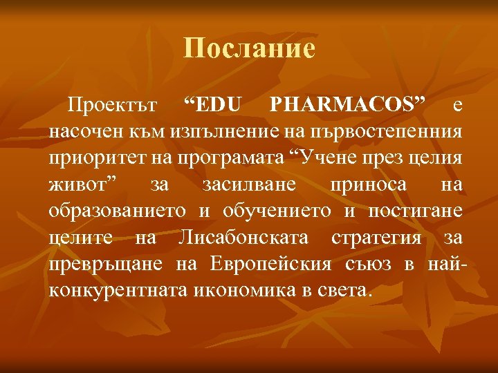 Послание Проектът “EDU PHARMACOS” е насочен към изпълнение на първостепенния приоритет на програмата “Учене през целия живот” за засилване приноса на образованието и обучението и постигане целите на Лисабонската стратегия за превръщане на Европейския съюз в найконкурентната икономика в света.