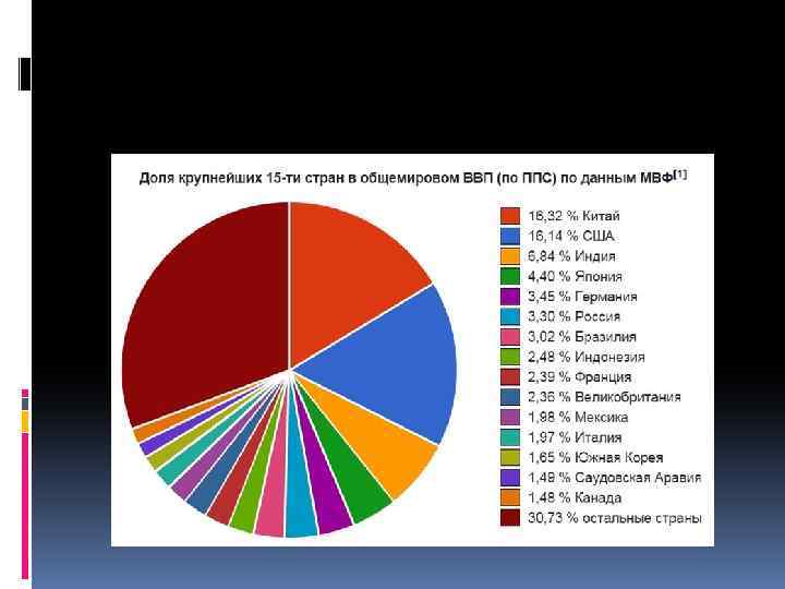 Список МВФ от 4 октября 2016 года млрд долл. сша №Страна 2013 2014 2015 КНР 16689 18228 19696 США 16692 17393 18037 Индия 6739 7357 7998 Япония 4683 4766 4843 Германия 3639 3763 3860 Россия 3734 3828 3725 Бразилия 3230 3292 3199 Индонезия 2515 2689 2848 Великобритания 2492 2615 2702 Франция 2542 2604 2666 Мексика 2069 2153 2230 Италия 2106 2136 2175