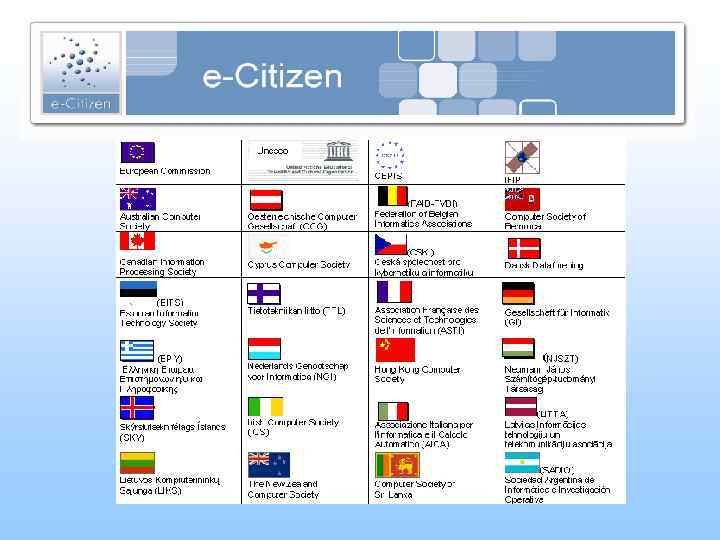 e-Citizen: Пути реализации Принятие решений и финансирование: • Правительство / Органы местного управления • Корпорации, предоставляющие он-лайн услуги: банки, туристические компании, торговля • Торговые объединения • Крупные компании (служащие разного уровня) Инфраструктура: • Образовательные учреждения разного уровня • Библиотеки • Центры по трудоустройству • Центры повышения квалификации