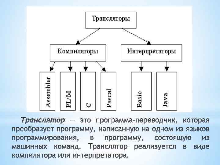 Чтобы получить работающую программу надо : * либо текст программы автоматически перевести в машинный код, а затем использовать отдельно от исходного текста программы; * либо сразу выполнять команды языка, указанные в тексте программы. Программы - компиляторы переводят текст исходной программы в машинный код (файл с расширением. exe). Программы - интерпретаторы осуществляют пооператорную обработку и выполнение исходной программы.