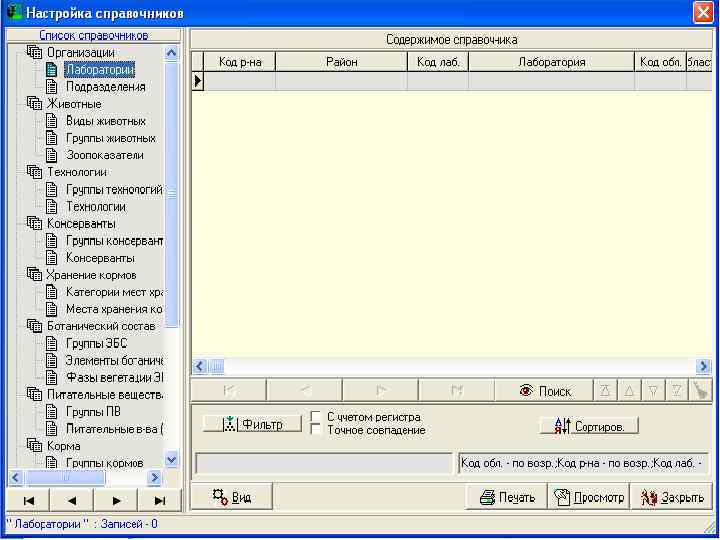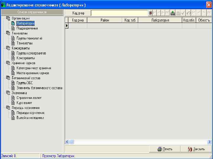 • Лаборатории - справочник лабораторий, исследующих корма. • Подразделения - в данный справочник заносятся названия подразделений хозяйств в том случае, если заготовка кормов или их хранение распределено в хозяйстве по подразделениям (отделениям, фермам). • Технологии - в верхней части данного справочника перечислены всевозможные технологии заготовки кормов, в нижней - консерванты, используемые в данных технологиях.