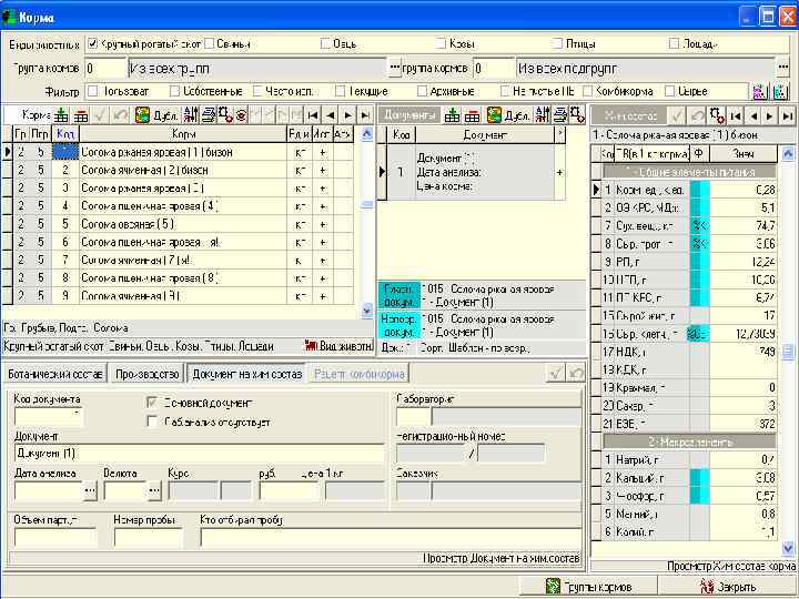• Для каждого корма в справочнике выводится информация по принадлежности к: • использованию по видам животных • группам и подгруппам кормов • виду сырья для комбикормов
