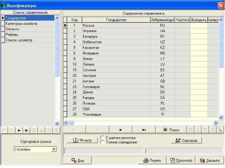 Окно “Кодификаторы» настройка справочников для просмотра в удобном для пользователя виде: • - установка порядка (“перетаскивая” показатель с помощью мыши) расположения и размера полей показателей справочника, • - ограничение количества элементов справочника (функция “Фильтр”), • - сортировка справочника по любому количеству показателей (функция “Сортировка”).