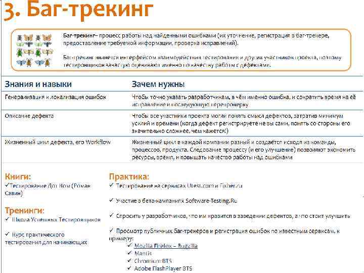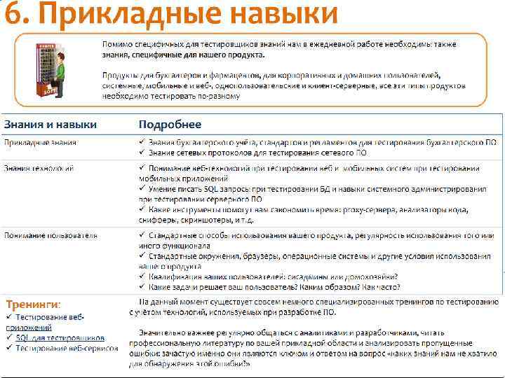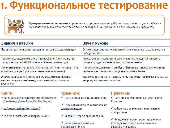Знания и навыки тестировщиков Что нужно знать и уметь хорошему тестировщику? Как эти знания получить? Как определить, каких знаний вам не хватает? В этой презентации структурированы знания, необходимые активным развивающимся тестировщикам, и собраны ссылки на полезную литературу и тренинги по рассматриваемым темам.