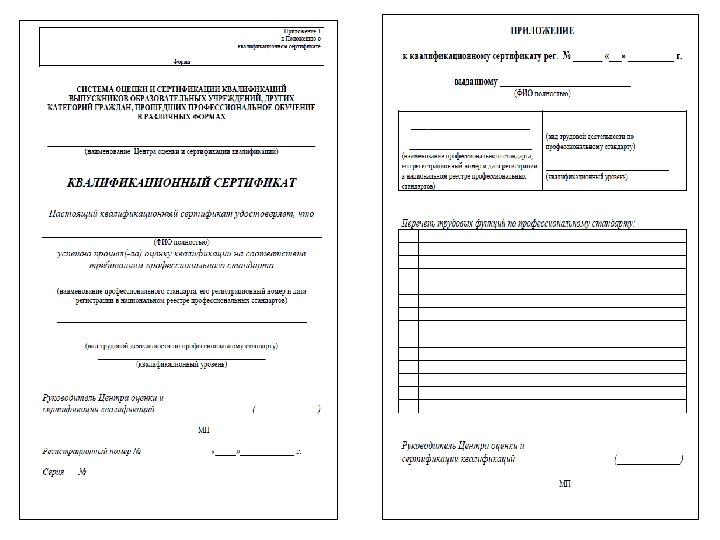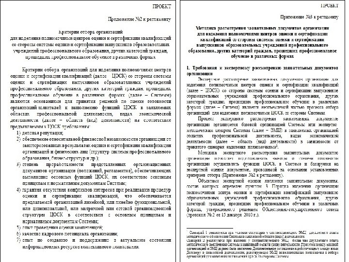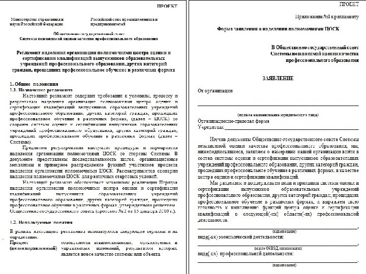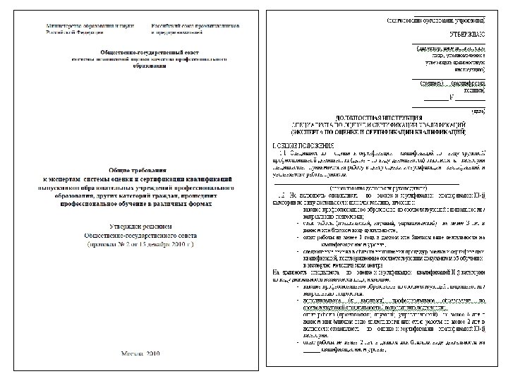 Нормативная база. Документы, принятые Общественно-государственным советом независимой оценки качества профессионального образования. üРегламент Общественно-государственного совета Системы независимой оценки качества профессионального образования (протокол № 1 от 20 октября 2010 г. ) üСостав Комиссий Общественно-государственного совета Системы независимой оценки качества профессионального образования (протокол № 1 от 20 октября 2010 г. ) üПорядок оценки и сертификации квалификаций выпускников образовательных учреждений профессионального образования, других категорий граждан, прошедших профессиональное обучение в различных формах (протокол № 2 от 15 декабря 2010 г. ) üПорядок конкурсного отбора организаций для наделения полномочиями экспертно-методических центров системы оценки и сертификации квалификаций выпускников образовательных учреждений профессионального образования, других категорий граждан, прошедших профессиональное обучение в различных формах (протокол № 2 от 15 декабря 2010 г. ) üПорядок наделения организации полномочиями центра оценки и сертификации квалификаций выпускников образовательных учреждений профессионального образования, других категорий граждан, прошедших профессиональное обучение в различных формах (протокол № 2 от 15 декабря 2010 г. ) üОбщие требования к экспертам системы оценки и сертификации квалификаций выпускников образовательных учреждений профессионального образования, других категорий граждан, прошедших профессиональное обучение в различных формах (протокол № 2 от 15 декабря 2010 г. ) üТиповая конкурсная документация для проведения открытого публичного конкурса по отбору организации для наделения полномочиями экспертно-методических центров (протокол № 3 от 12 апреля 2011 г. ) üТиповой договор на выполнение функций центра оценки и сертификации квалификаций (протокол № 3 от 12 апреля 2011 г. ) üПоложение о квалификационном сертификате (протокол № 5 от 20 июля 2012 г. ) üРекомендации по расчету тарифов на выполнение работ по оценке и сертификации квалификаций выпускников образовательных учреждений профессионального образования, других категорий граждан, прошедших профессиональное обучение в различных формах (протокол № 5 от 20 июля 2012 г. )