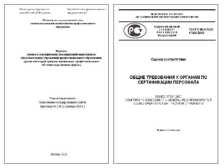 Нормативная база. Российские и международные стандарты в области стандартизации и сертификации. Ø Руководство ИСО/МЭК 2 "Общие термины и определения в области стандартизации и смежных видов деятельности". Ø Руководство ИСО/МЭК 16 "Свод правил по Системам сертификации третьей стороной на основе соответствующих стандартов". Ø Руководство ИСО/МЭК 39 "Общие требования к приемке Органов контроля". Ø Руководство ИСО/МЭК 40 "Общие требования к приемке Органов по сертификации". Ø Руководство ИСО/МЭК 56 "Орган по сертификации, методика оценки внутренней системы обеспечения качества". Ø Стандарт ИСО 10011 (ч. 1) "Общие руководящие указания по проверке систем качества. " Ø Стандарт ИСО 8402 -94 "Качество. Словарь". Ø ГОСТ Р 51000. 9 -97 (ЕМ 45013) "Общие критерии для органов, проводящих сертификацию персонала". . Ø ГОСТ Р 40. 101 -95 "Государственная регистрация систем добровольной сертификации и их знака соответствия". Ø EN ISO/IEC 17024: 2003 «Оценка соответствия. Общие требования к органам по сертификации персонала» .