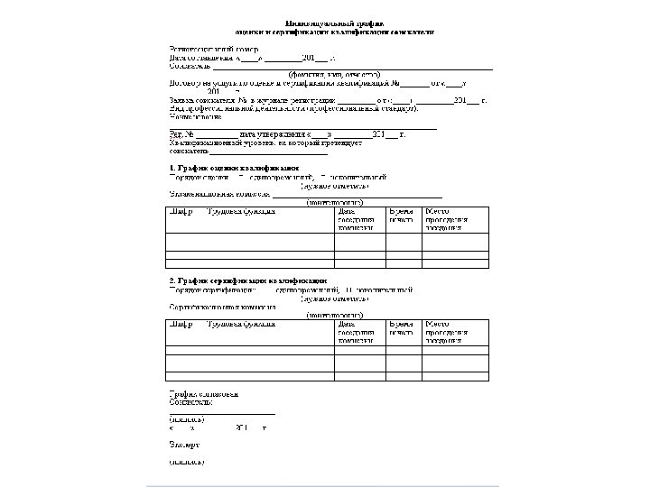 Эксперты по оценке и сертификации квалификаций Трудовая функция: 1. Осуществление работ по проведению индивидуальных собеседований с соискателями с целью определения порядка, графика и сроков оценки и сертификации квалификации Трудовые действия: Ø- выяснение потребности соискателя в необходимости подтверждения (признания) квалификации; Ø- рассмотрение предоставленных соискателем документов; Ø- разъяснение соискателю процедур и сертификации квалификаций; Øпроведение очного интервью (заочного анкетирования) с соискателем Ø- принятие совместно с соискателями решений по результатам очного интервьюирования (заочного анкетирования) с соискателем, подготовка заключений (рекомендаций), в том числе по выявленным «узким местам» в компетенциях соискателей, проектирование вариантов образовательных программ (наборов учебных модулей), обеспечение объективности и достоверности заключений (рекомендаций); Ø- определение совместно с соискателями порядка проведения оценки и сертификации квалификаций соискателей (единовременно или поэтапно по отдельным трудовым функциям, которые в итоге дают возможность получения сертификата); Ø- формирование совместно с соискателями индивидуального графика оценки и сертификации квалификаций соискателя, содержащую информацию об области оценки и области сертификации (перечни трудовых функций, действий, знаний, умений), сроках и последовательности проведения оценки квалификации, сроках и последовательности процедур сертификации, и корреспондирующегося с графиками заседаний экспертной и сертификационной комиссий по виду деятельности; Ø- консультирование соискателей по всем вопросам проведения оценки и сертификации квалификации Специфические знания: требования и установленный порядок проведения индивидуального собеседования с соискателями с целью определения порядка, графика и сроков оценки и сертификации квалификации Специфические умения: применять технику проведения собеседования с соискателями в соответствии с установленными требованиями, в т. ч. подготавливать вопросы для индивидуального собеседования с соискателями с целью определения порядка, графика и сроков оценки и сертификации квалификации, анализировать полученную в ходе собеседования информацию, подготавливать заключения (рекомендации) по результатам собеседования, обеспечивая их объективность и достоверность